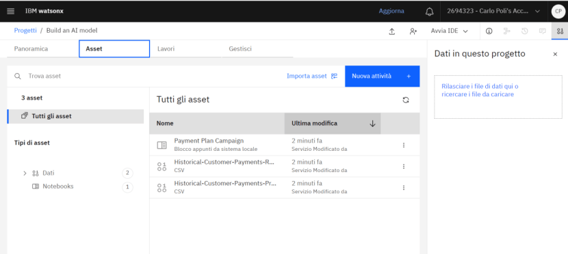 - Click on the Assets tab. This will display all the assets associated with your project, like data, models, notebooks, etc. or it will allow to upload data if not associated yet.